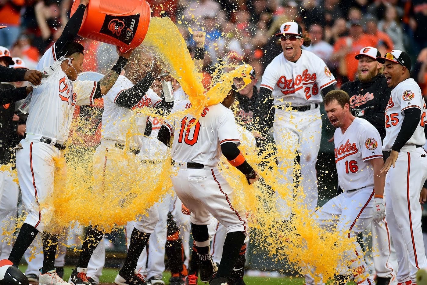 The Orioles celebrate an opening day walk off home run by Adam Jones (Photo: The Baltimore Sun)