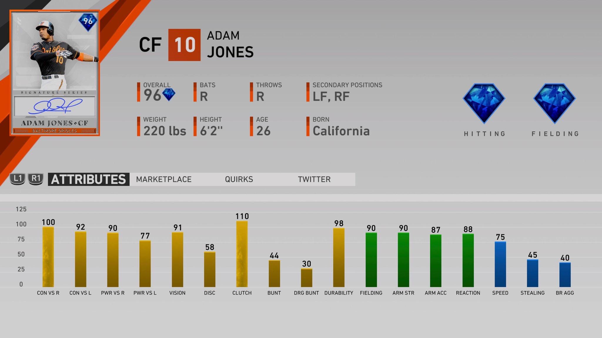 What’s even more impressive are Jones’ fielding stats. He has 90 fielding, 90 arm strength, 87 arm accuracy, and 88 reaction with the ability to play all three outfield positions!