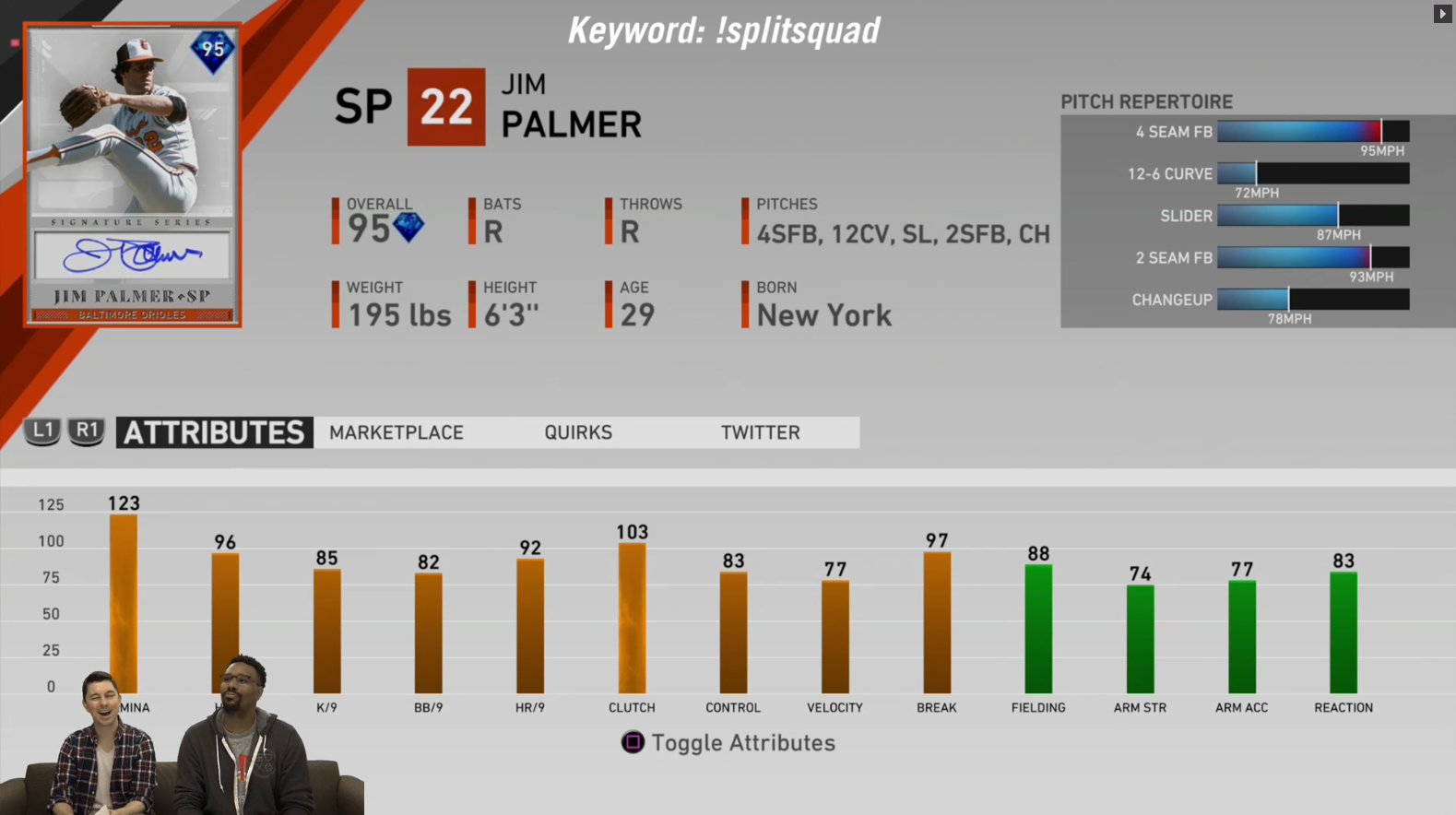 Palmer’s repertoire includes a 4-seam fastball, a 2-seam fastball, a 12-6 curveball, a slider, and a changeup. What makes this card so great is the 123 stamina stat, giving Palmer the ability to go deep into a game.