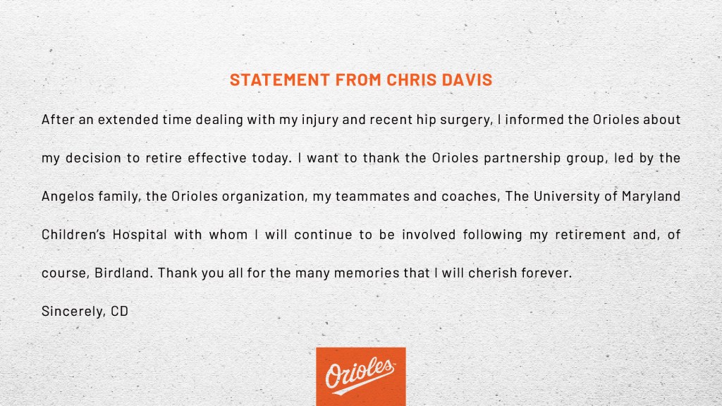 Davis had hip surgery back in May to repair a labrum. He was already going miss the entire 2021 season. He finally decided to call it a career on August 12, 2021, with one year remaining on his contract. He thanked the organization and, most of all, the fans.