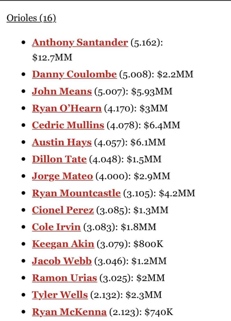 With the small handful of free agents, the Orioles will be left with a large number of arbitration-eligible players. After having six such players last season, that number jumps up to 16 this season, with Cedric Mullins, Austin Hays, Anthony Santander and John Means expected to receive the largest raises.