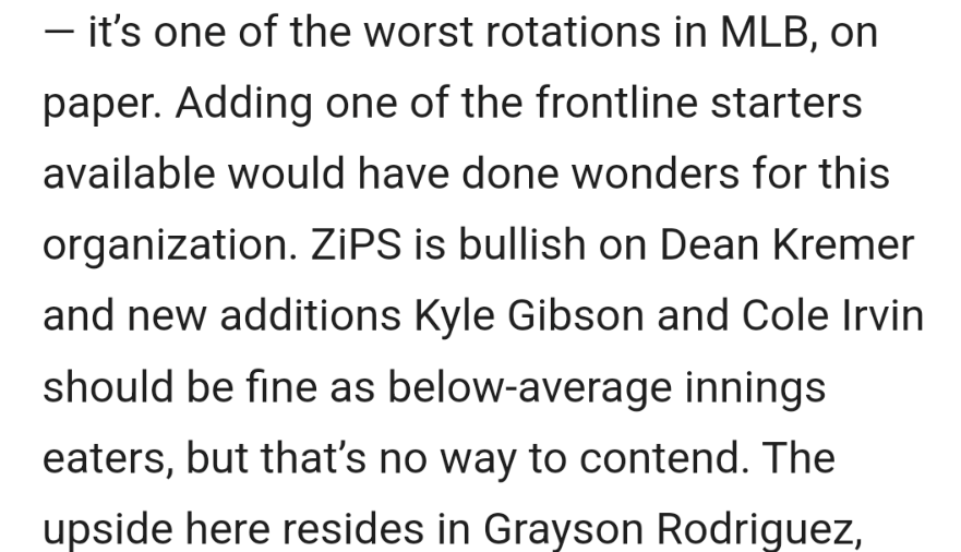 The rotation looked formidable, with Burnes, Kyle Bradish, Grayson Rodriguez, Dean Kremer and Tyler Wells or John Means to round it out. There was also Cole Irvin and Albert Suárez capable of spot starting, and the minors had youngsters Cade Povich and Chayce McDermott to go along with Bruce Zimmermann and Jonathan Heasley.