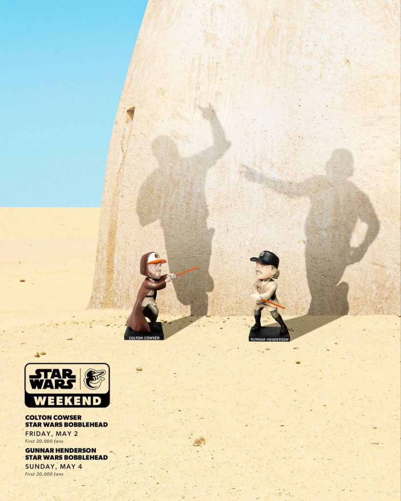 Star Wars weekend will be highlighted by two bobblehead giveaways, with Colton Cowser (May 2) and Gunnar Henderson (May 4) to the first 20,000 fans. Both will be in Jedi attire and swinging lightsabers.